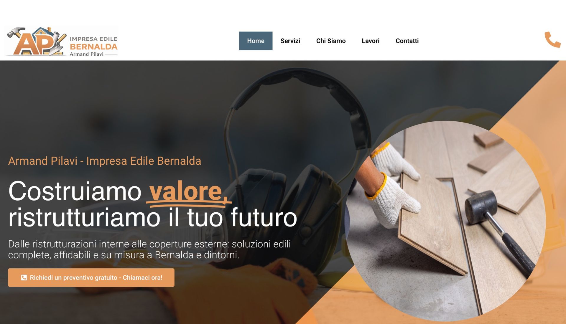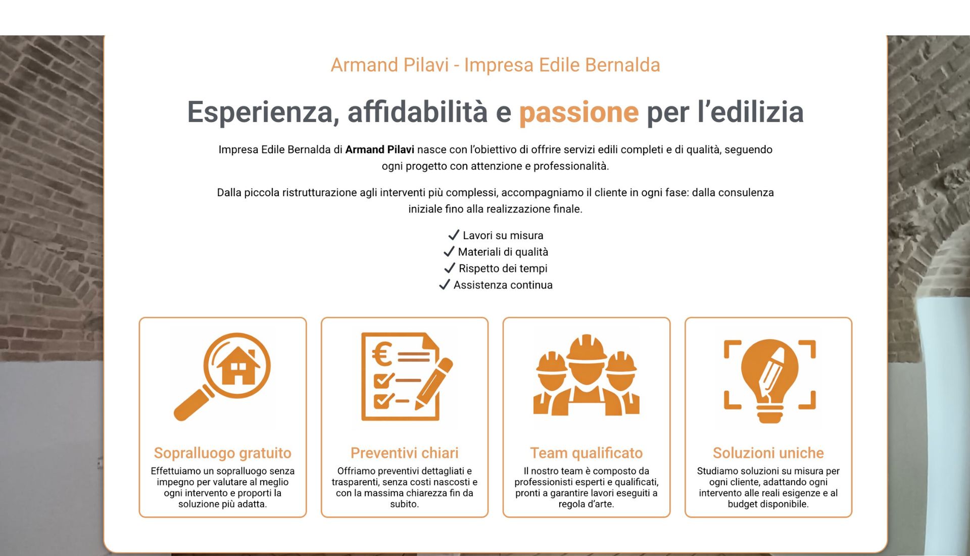 - Identità Visiva Coerente: Il sito riprende l’iconografia del logo (strumenti di lavoro e casa) e la espande in un layout grafico moderno. Questo posiziona Armand Pilavi come un professionista al passo con i tempi, distinguendosi nettamente dai competitor più tradizionali.
